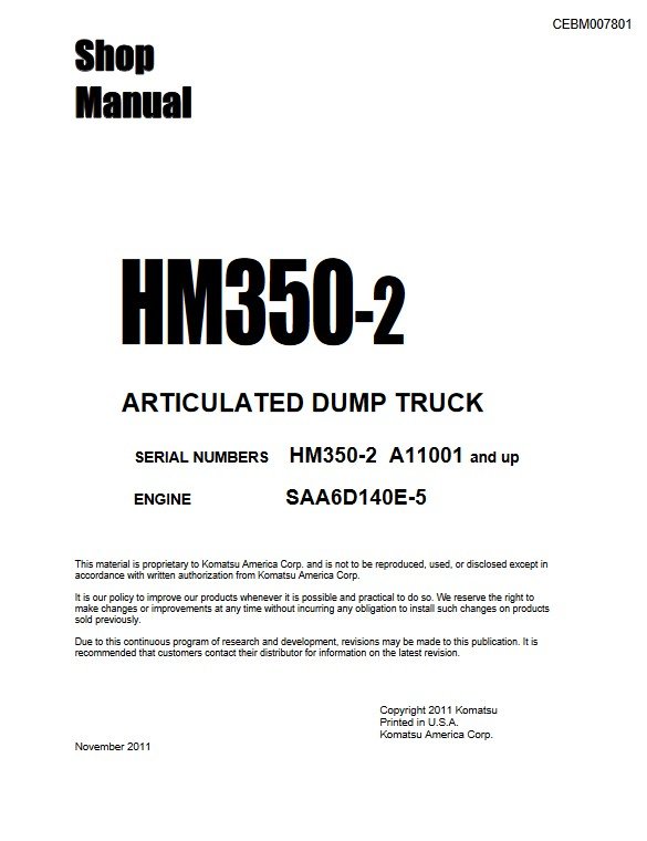 Komatsu HM350-2 USA Dump Truck S.N A11001-UP Workshop Manual