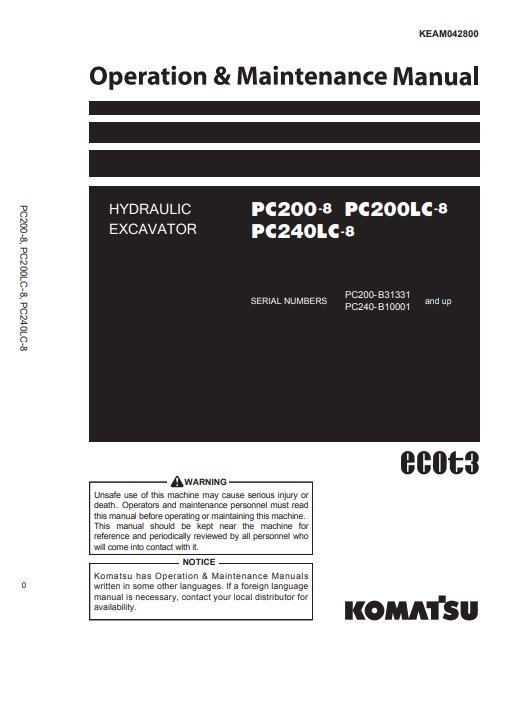 Comprehensive guide for operating and maintaining Komatsu PC200-8, PC200LC-8, and PC240LC-8 excavatorsKomatsu PC200-8, Komatsu PC200LC-8, Komatsu PC240LC-8 Operation and Maintenance Manual