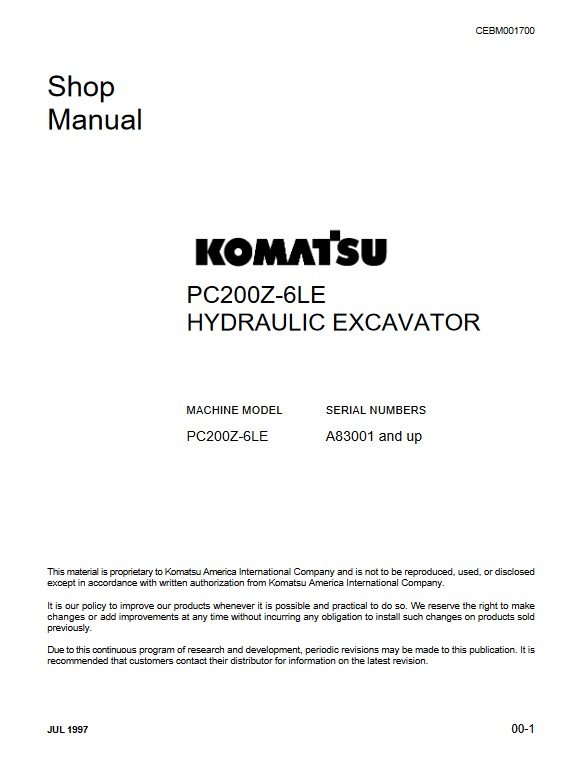 The Komatsu PC200Z-6LE Excavator Workshop Repair Manual is an essential resource for professionals and enthusiasts alike, providing comprehensive guidance on maintenance and repair procedures. This manual includes detailed diagrams, troubleshooting tips, and step-by-step instructions to ensure optimal performance and longevity of your excavator. With its user-friendly format, you can easily navigate through complex repairs, saving time and reducing downtime on the job. Invest in this manual to enhance your technical knowledge and keep your equipment running smoothly