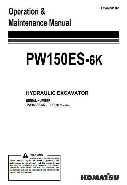 The Komatsu PW150ES-6K Excavator Operation & Maintenance Manual is an essential resource for operators and maintenance personnel, providing comprehensive guidance on the efficient operation and upkeep of your excavator. This manual includes detailed instructions, diagrams, and troubleshooting tips to ensure optimal performance and longevity of your equipment. With clear, step-by-step procedures, it empowers users to perform routine maintenance and repairs confidently, minimizing downtime and enhancing productivity on the job site. Invest in this manual to maximize the value and reliability of your Komatsu excavator