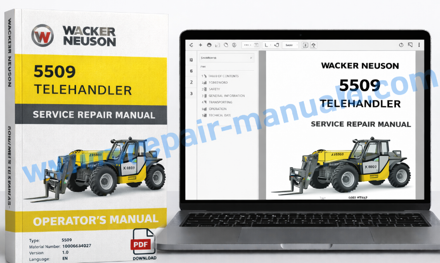 Get the complete Service Repair Manual for Wacker Neuson 5509 Telehandler in high-quality PDF format. This comprehensive manual is designed for technicians, mechanics, and equipment owners who need accurate guidance for maintenance, troubleshooting, and repairs.
