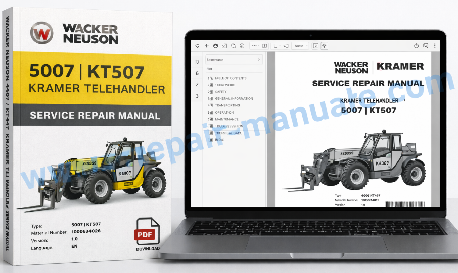 Get the complete Service Repair Manual for Wacker Neuson 5007, KT507 Kramer Telehandlers in easy-to-use PDF format. This detailed manual is designed for technicians, mechanics, and equipment owners who need accurate repair, maintenance, and troubleshooting information.