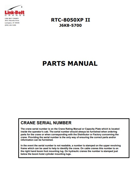 Compatible Machine Model : Link Belt RTC-8050XP II (J6K8-5700) Crane