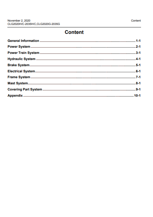Compatible Model :Liugong CLG2020H-C, CLG2035H-C, CLG2020G, CLG2035G Forklift Trucks Service Repair Manual