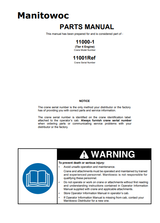 The Manitowoc 11000-1 Crane Parts Manual is an essential resource for operators and technicians, providing comprehensive information on the maintenance and repair of the Manitowoc 11000-1 crane. This manual includes detailed diagrams, part numbers, and specifications, ensuring you have the necessary tools to keep your crane in optimal working condition. With clear instructions and expert insights, this manual not only enhances your understanding of the crane’s components but also helps minimize downtime and extend the lifespan of your equipment. Invest in the Manitowoc 11000-1 Crane Parts Manual to ensure your operations run smoothly and efficiently