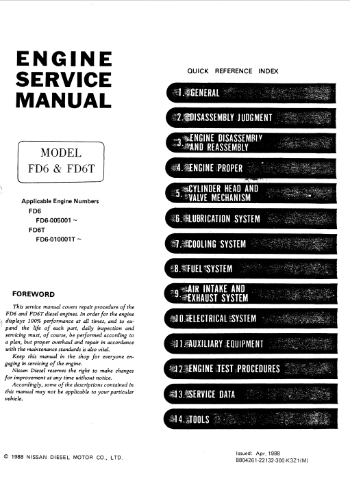 Nissan FD6, FD6T Diesel Engine Service Repair Manual (Related Kobelco Products)