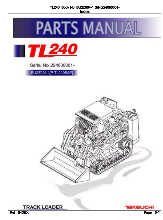 The Takeuchi TL240 Track Loader Parts Manual is an essential resource for anyone looking to maintain or repair their TL240 model with precision and confidence. This comprehensive manual provides detailed diagrams, part numbers, and specifications, ensuring that you can easily identify and source the correct components for your machine. With clear illustrations and step-by-step instructions, it simplifies the process of troubleshooting and replacing parts, ultimately enhancing the performance and longevity of your track loader. Whether you are a seasoned technician or a DIY enthusiast, this manual is designed to empower you with the knowledge needed to keep your equipment running smoothly and efficiently, making it a valuable addition to your maintenance toolkit