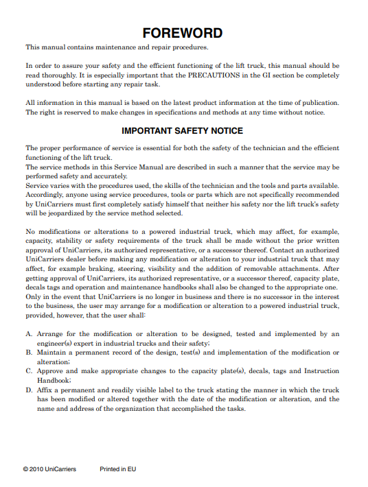 The Factory was highly recommended use this manual for Technicians before you touch your UniCarriers Forklift
