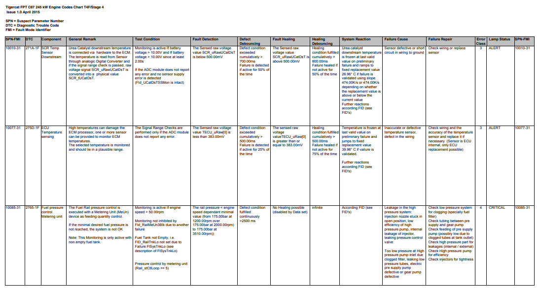 Tigercat FPT C87 245 kW Engine Codes Chart T4F/Stage 4