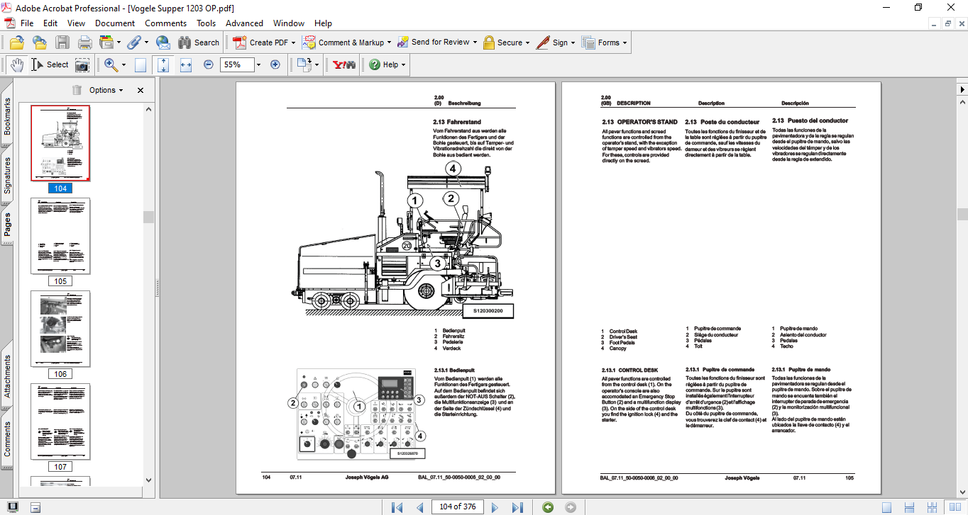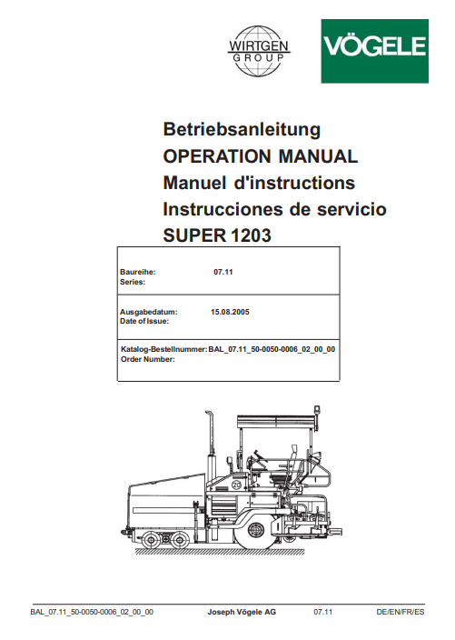 The Vogele Super 1203 Wheeled Paver Operation Manual is an essential resource for operators seeking to maximize the efficiency and performance of their paving equipment. This comprehensive guide provides detailed instructions on operation, maintenance, and troubleshooting, ensuring that users can achieve optimal results on every job. With clear diagrams and step-by-step procedures, this manual empowers operators to enhance their skills and maintain the longevity of their paver, making it a valuable addition to any construction team’s toolkit