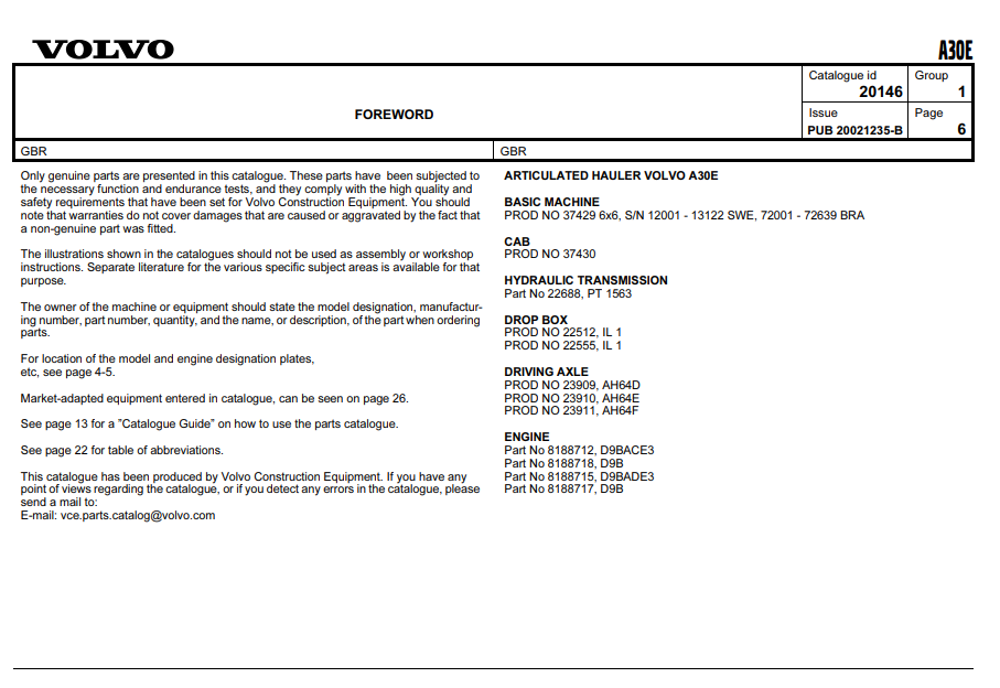 Volvo A30E Dump Truck Parts Catalog