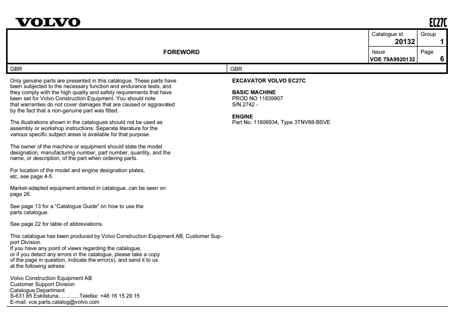 Volvo EC27C Excavator Parts Catalog
