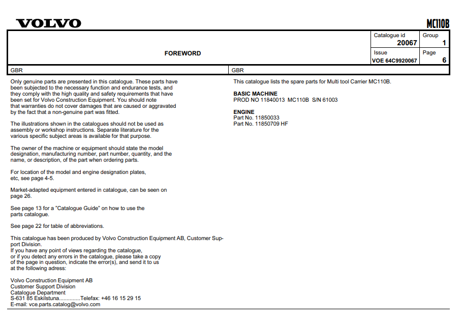 Volvo MC110B SkidSteer Loader Parts Catalog