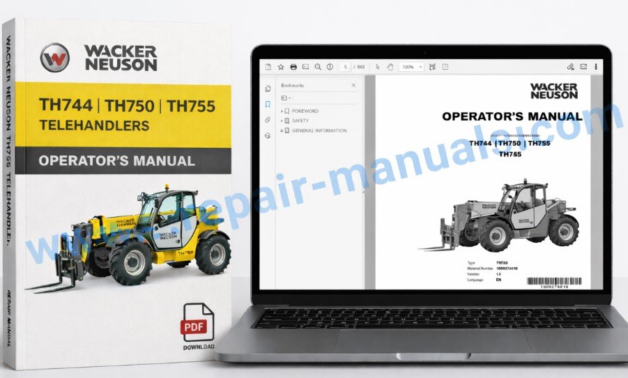 Get the complete Operator’s Manual for Wacker Neuson TH744, TH750, and TH755 Telehandlers in convenient PDF format. This manual is essential for operators, technicians, and equipment owners who want to ensure safe operation, proper handling, and maximum performance of their machines.