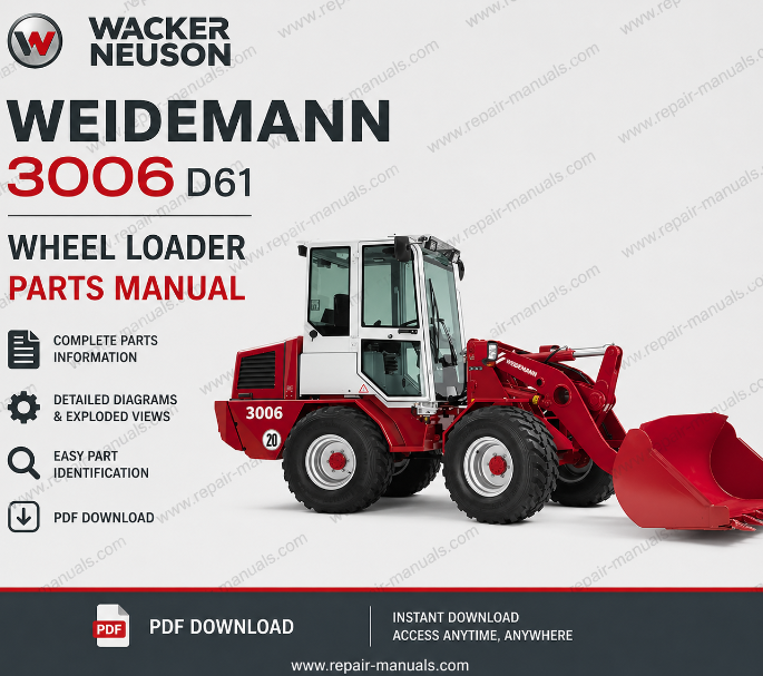 Get instant access to the Wacker Neuson Weidemann 3006 D61 Wheel Loader Parts Manual in high-quality PDF format. This comprehensive OEM parts catalog is an essential tool for technicians, mechanics, and equipment owners who need accurate parts identification and reliable reference data.