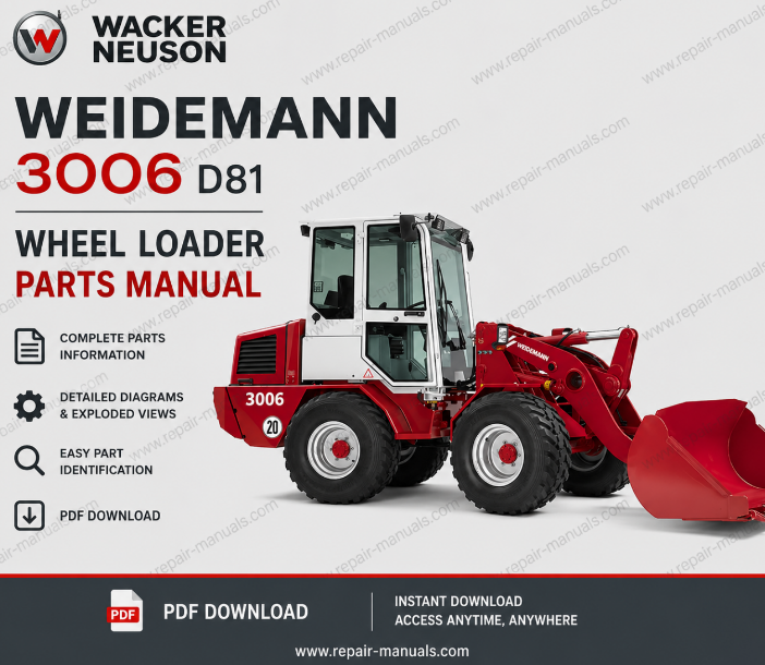 Get instant access to the Wacker Neuson Weidemann 3006 D81 Wheel Loader Parts Manual in high-quality PDF format. This comprehensive OEM parts catalog is an essential tool for technicians, mechanics, and equipment owners who need accurate parts identification and reliable reference data.