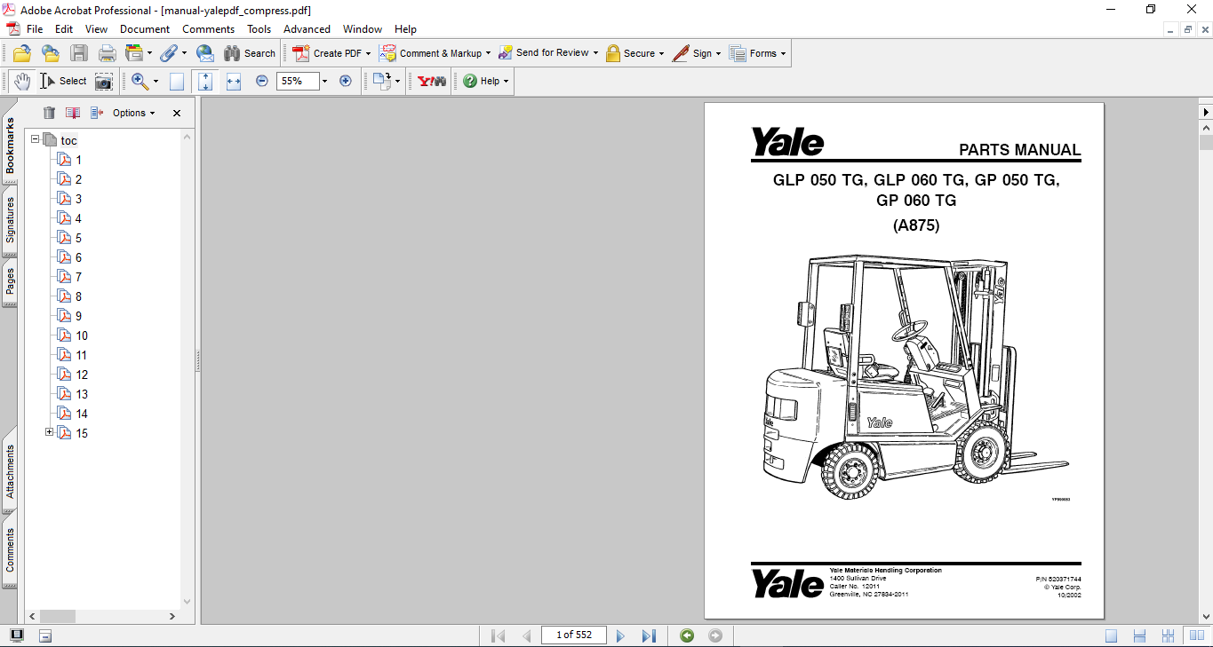 Yale Forklift A875 (GLP 050 TG, GLP 060 TG, GP 050 TG, GP 060 T) Parts Manual