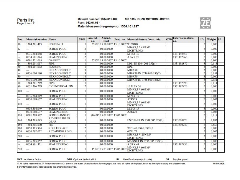 With This Original Factory Parts Manuals The Technician can easily find any Part Number and Correct Part encountered in the operation of your ZF Transmission Models of :