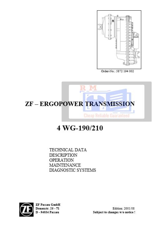 The ZF 4 WG-190 / 4 WG-210 Transmission Repair Manual is the official service guide designed to support professional technicians, mechanics, and service centers in maintaining and repairing ZF’s proven 4-speed powershift transmissions. These transmissions are commonly used in construction, industrial, and material handling equipment.